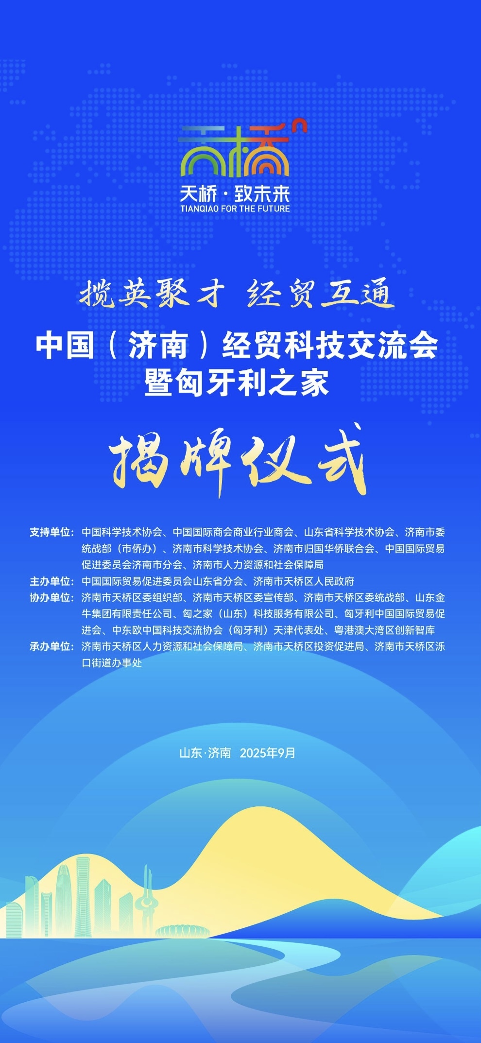 9月20日上午,中国(济南)经贸科技交流会暨匈牙利之家揭牌仪式在天桥区金牛建材家居博览中心举办。此次活动以“揽英聚才 经贸互通”为主题,这是在中匈新时代全天候全面战略伙伴关系下天桥区与匈牙利企业的第一次深入合作,旨在共同打造“匈牙利之家”,集展示、体验、交易、交流、创业孵化与创新合作于一体的中匈交流综合平台,推动双方在人才、文化、旅游、农业、健康产品等方面的交流合作,实现双方共赢。