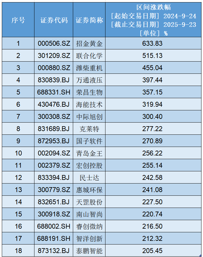具体来看,涨幅超2倍鲁股有18只,潍柴重机(000880.SZ)、万通液压(830839.BJ)等7只个股涨超3倍。其中,招金黄金(000506.SZ)、联合化学(301209.SZ)2只个股实现超5倍涨幅,分别上涨633.83%、515.13%,成为本轮行情中的“涨幅王”。