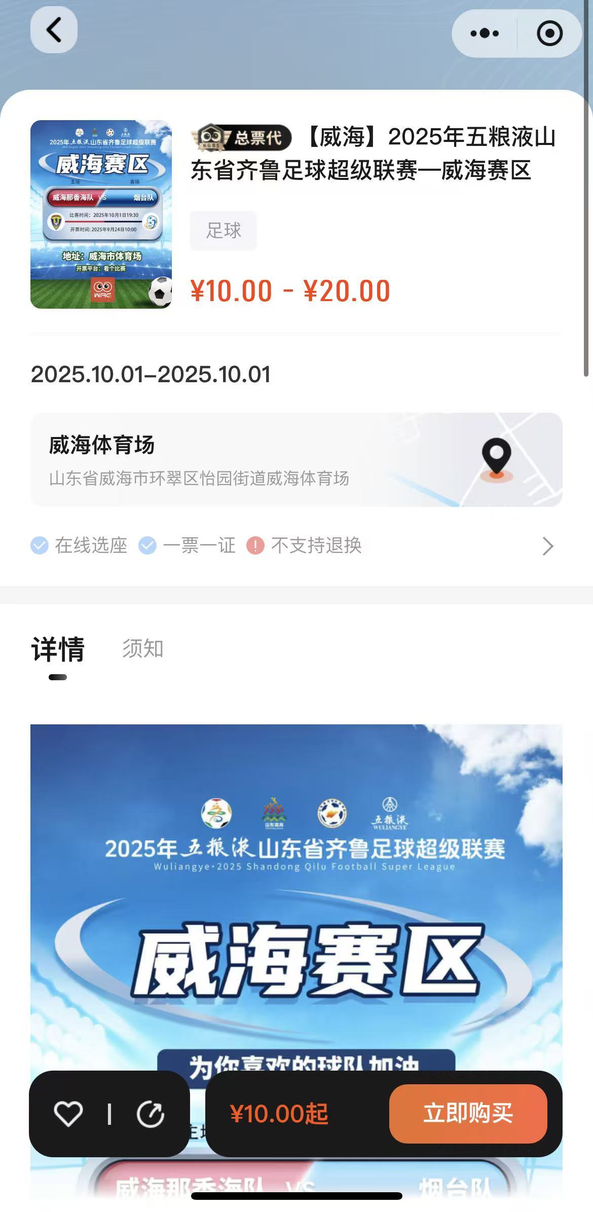 想看球赛的朋友,可微信搜索小程序“看个比赛”,选择“【威海】2025年五粮液山东省足球超级联赛-威海赛区”进行购票。票价分为两档,主队和客队票均为10元/人,20元票档包含观赛T恤1件。