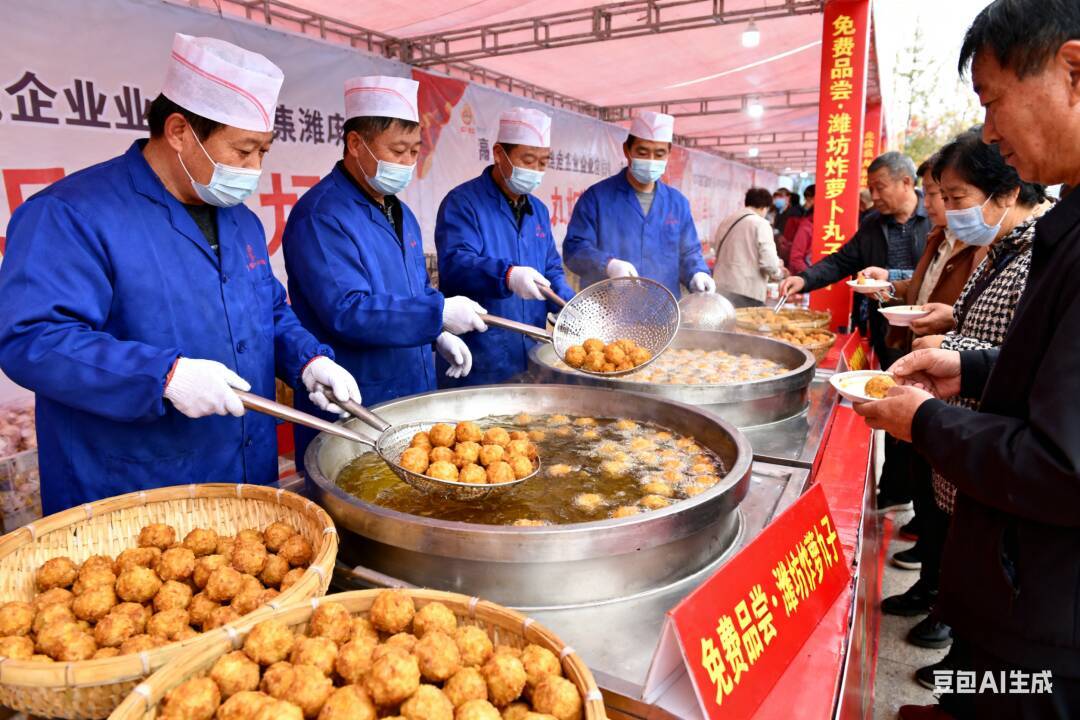 组织本地知名萝卜丸子制作加工企业现场制作,邀请市民、游客免费品尝潍坊特色美食。