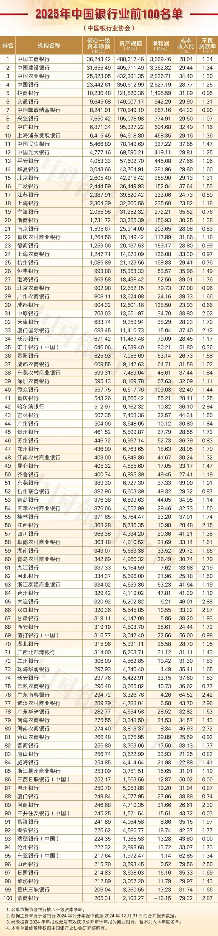 9月28日,中国银行业协会正式发布2025年度“中国银行业前100名单”。