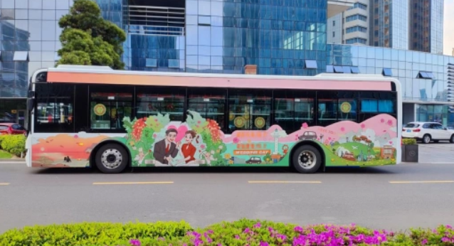 枣庄市的一家公交公司也在2023年推出了520路、1314路公交婚车,采用纯电动公交车,根据新人的不同需求提供线路、车身涂装、车载视频、车厢装饰以及氛围灯等定制服务,在社区、婚姻登记处宣传推广婚礼公交,很受年轻人欢迎。