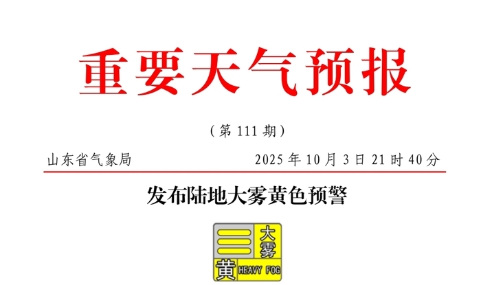 山东省气象台于10月3日21时40分发布陆地大雾黄色预警:预计3日夜间到4日早晨,聊城、德州、滨州、东营、济南、淄博、潍坊、烟台和日照的部分地区将出现能见度低于500米的浓雾,局部地区能见度不足200米。请做好防范工作。