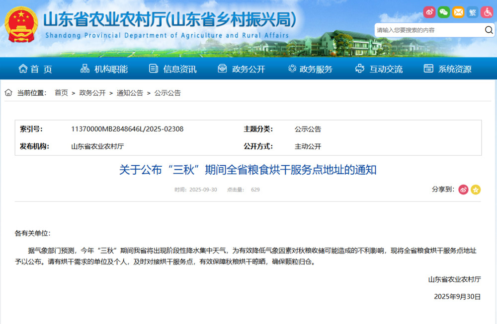 山东省农业农村厅关于公布“三秋”期间全省粮食烘干服务点地址的通知