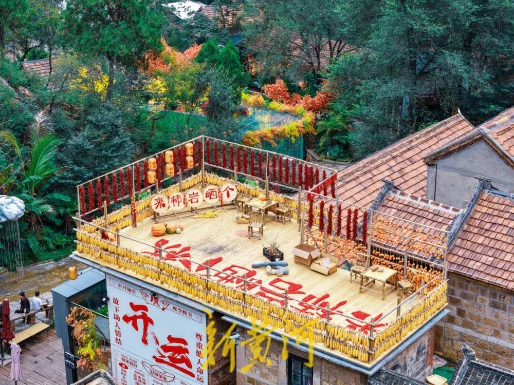 淄博博山区红叶柿岩景区以“来红叶柿岩晒个秋”为主题,山间红叶与晾晒的玉米、辣椒等秋实相映成趣,打造出兼具田园诗意与视觉冲击力的打卡场景;