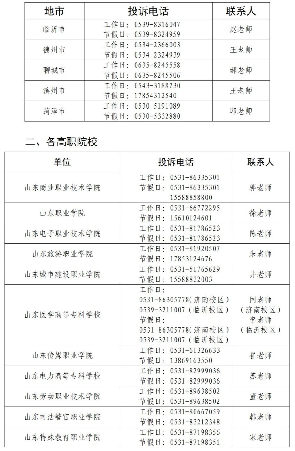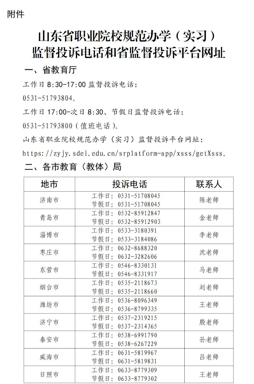 10月9日,山东省教育厅网站发布公告,为进一步畅通问题诉求反映渠道,规范职业院校办学行为,提升职业院校治理能力和人才培养质量,现向社会公布省教育厅和各市教育(教体)局、高职院校规范办学(实习)监督投诉电话及省监督投诉平台网址。