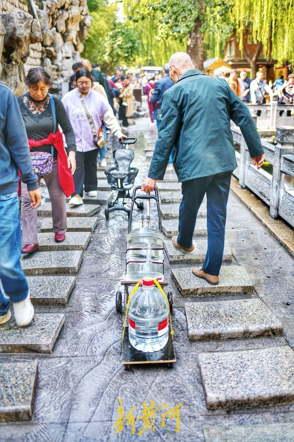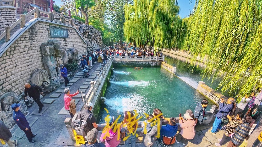 除了市民,不少游客也专程前来打卡。黑虎泉畔人流涌动,大家听着如虎啸一般的泉声,踩着石板来来往往,脚下泉水淙淙流过,尽享泉水带来的乐趣。“大约一周前,黑虎泉就开始从洞里往外冒水了。”现场工作人员告诉记者,这几天,黑虎泉的人气爆棚,他们在石板路旁加强了值守,一边叮嘱来往游客注意安全,一边还成了泉水的“代言人”,热情为市民游客答疑解惑。