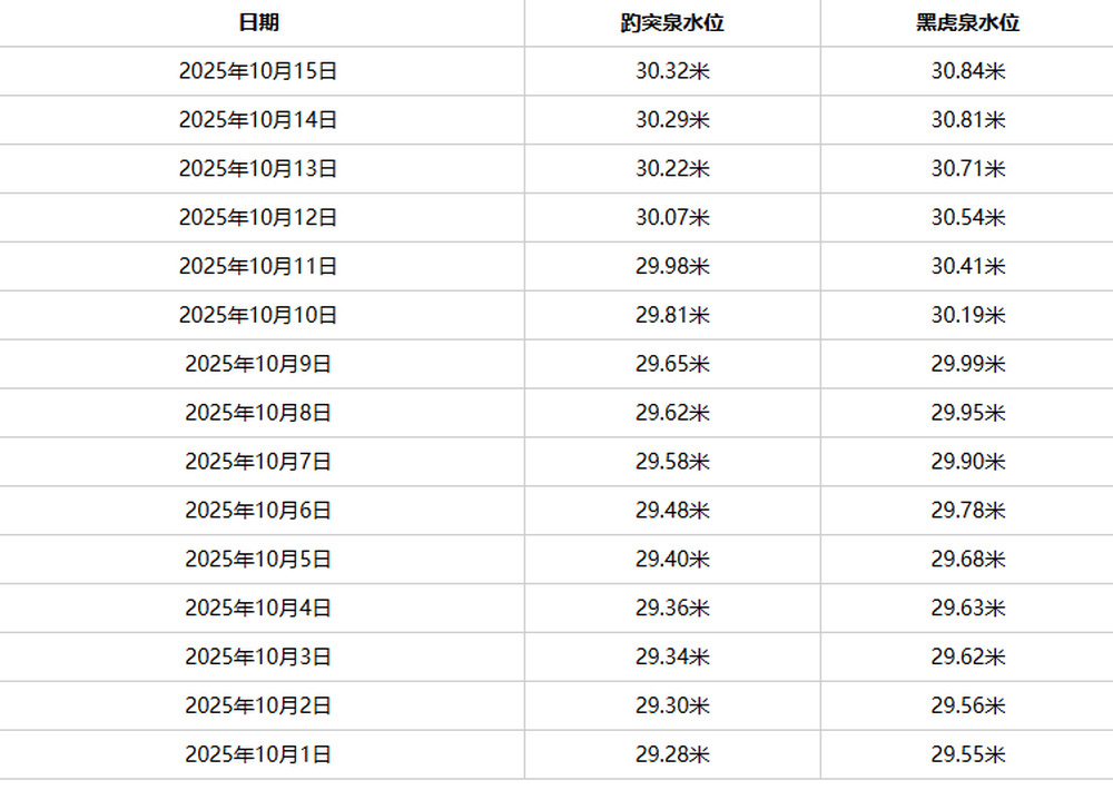 据济南市城乡水务局官方网站信息,10月15日早7时,趵突泉水位达30.32米,黑虎泉水位攀升至30.84米,两大泉群均较前一日上涨了3厘米。这一数据不仅延续了近期济南泉群水位持续走高的良好态势,更让黑虎泉超越2004年创下的历史最高值,成为新纪录。