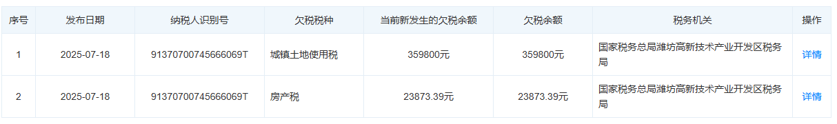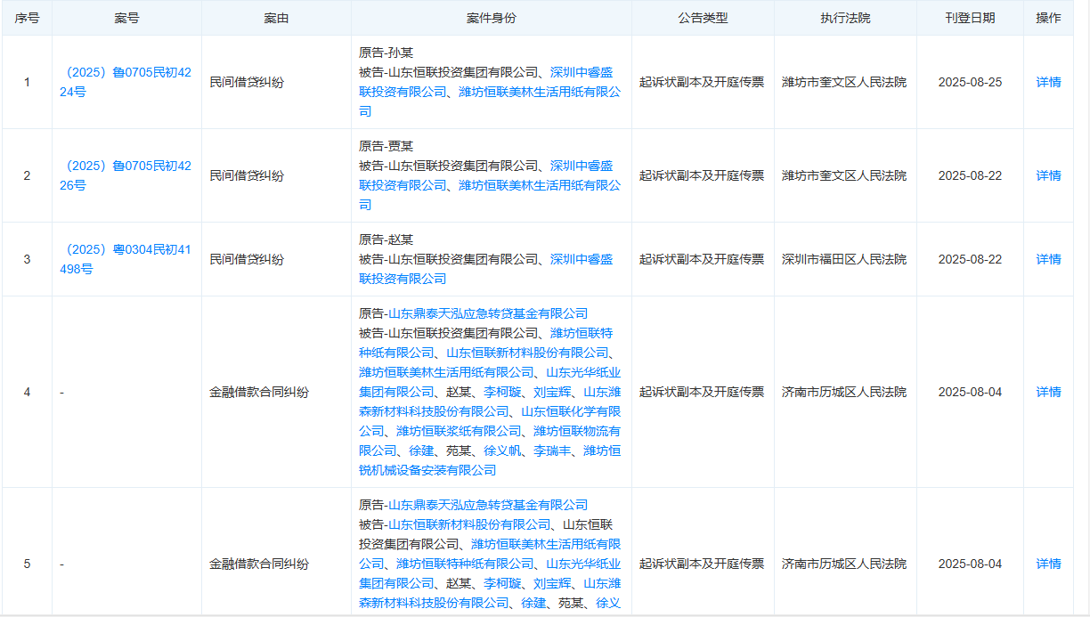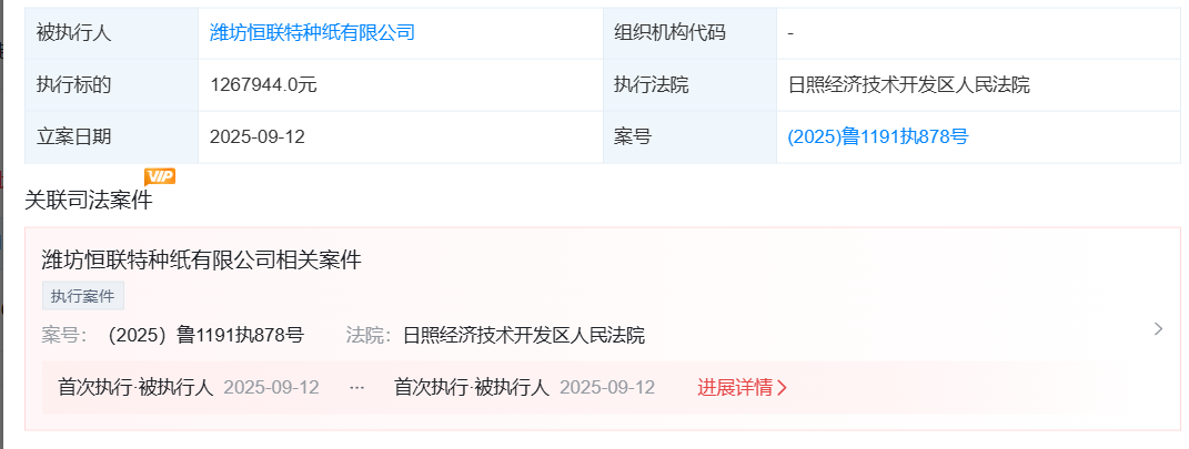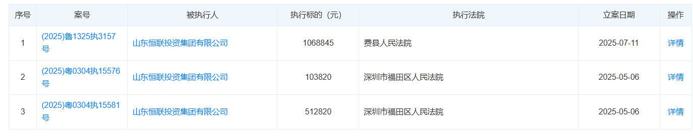 山东恒联集团自身也面临经营压力。今年以来,集团已多次被深圳市福田区人民法院、费县人民法院列为被执行人,执行标的分别为51.28万元、10.38万元及106.88万元。同时,集团因多起经济纠纷案件陷入经营危机,并因拖欠税款被国家税务总局潍坊高新技术产业开发区税务局列入欠税公告名单。