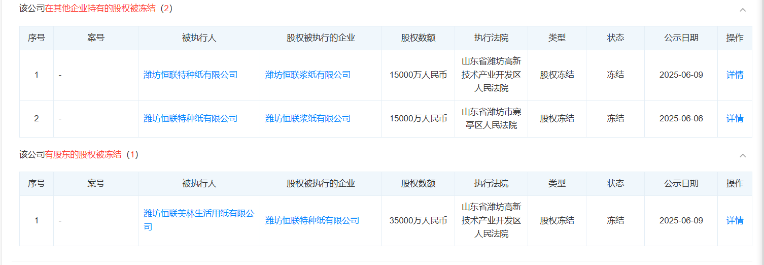今年以来,恒联特种纸频现经营风险。6月,其在潍坊恒联浆纸有限公司持有的股权被山东潍坊高新技术产业开发区法院和寒亭区法院冻结,股权数额各1500万元;其控股股东潍坊恒联美林生活用纸有限公司所持有的全部股权亦被冻结,涉及金额3.5亿元。9月12日,公司被日照经济开发区人民法院列为被执行人,执行标的约126.79万元。