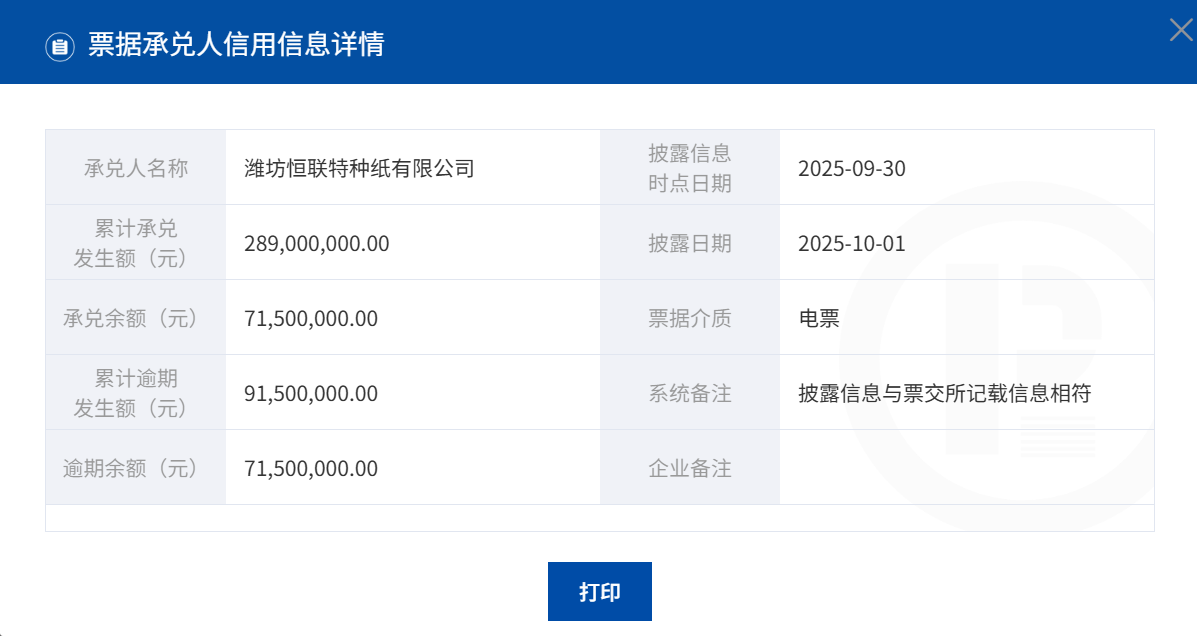 10月13日,上海票据交易所票据信息披露平台发布《截至2025年9月30日承兑人逾期名单》。名单显示,在2025年4月1日至9月30日期间,发生3次以上票据逾期,且月末有逾期余额或当月存在票据逾期行为的承兑人共计775家。潍坊永新纸业有限公司(以下简称:“永新纸业”)与潍坊恒联特种纸有限公司(以下简称:“恒联特种纸”)上榜。