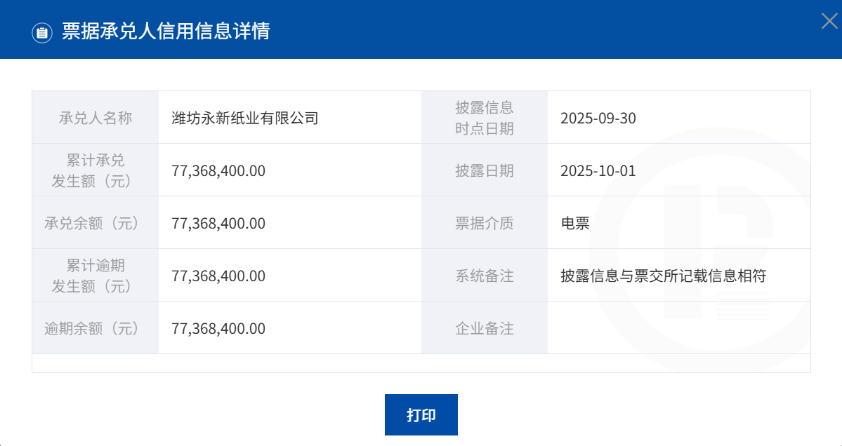 上海票据交易所官网“信息披露平台”栏目中的票据承兑人信用信息详情显示,永新纸业累计承兑发生额、承兑余额、累计逾期发生额及逾期余额均为77,368,400元。该公司成立于2003年,注册资本700万元,法定代表人李瑞丰,由山东恒联投资集团有限公司全资控股,实际控制人徐建。