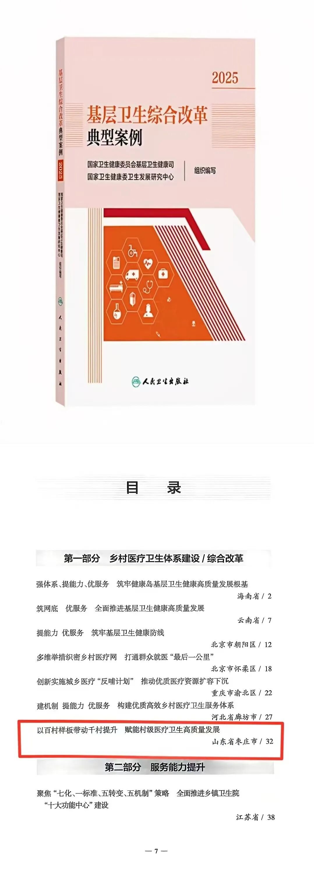 赋能村级医疗卫生高质量发展”入选国家卫生健康委《基层卫生综合改革典型案例2025》。2024年,枣庄市在全省率先启动实施村卫生室三年提升行动,利用3年时间打造样板村卫生室300家,持续提升村级医疗卫生服务能力。截至目前,全市各级投入1.5亿元,高标准打造样板村卫生室270家,帮扶薄弱村卫生室110家,带动全市所有的村卫生室达到“五有三提升”标准,实现村级医疗卫生服务基础设施、人才队伍、服务能力、规范管理、运行保障“五大工程”全面提升,村卫生室诊疗人次和业务收入同比增长30%以上,基层医疗卫生机构就诊率提升至65.93%,实现了乡村医疗卫生服务体系从“保基本”向“高品质”的跨越升级。