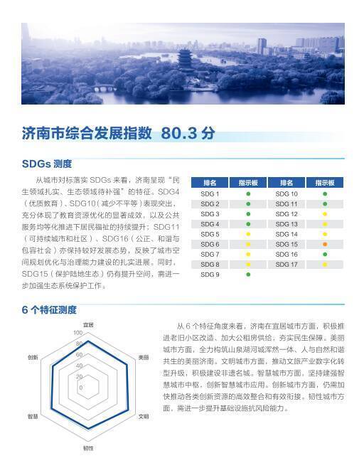 从城市对标落实SDGs来看,济南“民生领域扎实”的特征明显,SDG4(优质教育)、SDG10(减少不平等)表现突出,充分体现了教育资源优化的显著成效,以及公共服务均等化推进下居民福祉的持续提升;SDG11(可持续城市和社区)、SDG16(公正、和谐与包容社会)亦保持较好发展态势,反映了城市空间规划优化与治理能力建设的扎实进展。