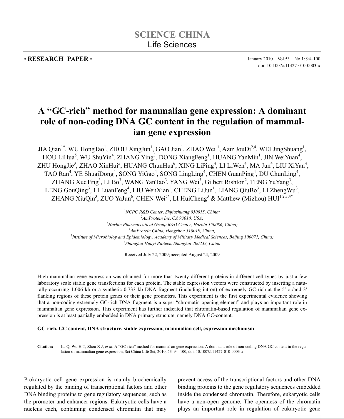 1、Jia Q, Wu H, Zhou X, Gao J, Zhao W, Aziz J, Wei J, Hou L, Wu S, Zhang Y, Dong X, Huang Y, Jin W, Zhu H, Zhao X, Huang C, Xing L, Li L, Ma J, Liu X, Tao R, Ye S, Song Y, Song L, Chen G, Du C, Zhang X, Li B, Wang Y, Yang W, Rishton G, Teng Y, Leng G, Li L, Liu W, Cheng L, Liang Q, Li Z, Zhang X, Zuo Y, Chen W, Li H, Hui MM. A "GC-rich" method for mammalian gene expression: a dominant role of non-coding DNA GC content in regulation of mammalian gene expression. Sci China Life Sci. 2010 Jan;53(1):94-100. doi: 10.1007/s11427-010-0003-x. Epub 2010 Feb 12. PMID: 20596960.