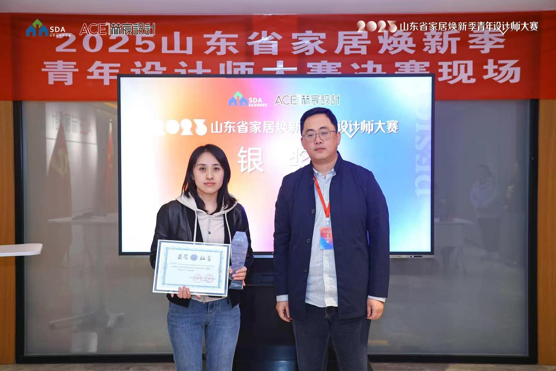山东省装饰协会轮值会长/赫宸设计总经理栾滨为银奖获奖选手苏玲娟颁发荣誉证书及奖杯。