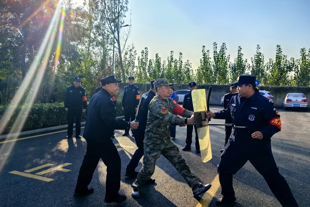 还模拟不法人员强行闯入的突发状况,指导各组成员快速响应、协同配合,组成严密防护队形,让大家熟练掌握情绪安抚、器械使用和现场控制等应急处置要领,切实在“真场景”中练就真本事。