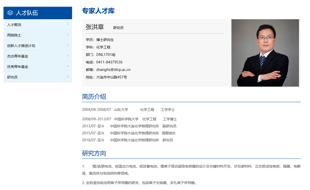 据中国科学院大连化学物理研究所官网介绍,张洪章,博士,研究员,硕士生导师,现任中国科学院大连化学物理研究所研究员、高性能储能电池关键材料研究组组长。