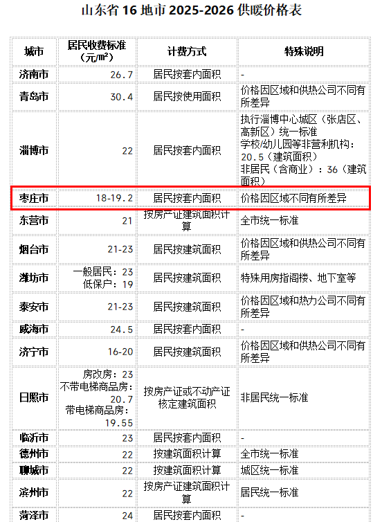 随着2025-2026供暖季临近,山东省16地市供暖价格陆续公布。枣庄以18-19.20元/平方米(套内面积)的居民供热价格,在全省形成显著价格优势,加之近十五年价格稳定未涨的民生坚守,让今冬的“暖保障”带着满满的“民生温度”,成为惠及全市居民的民心工程。