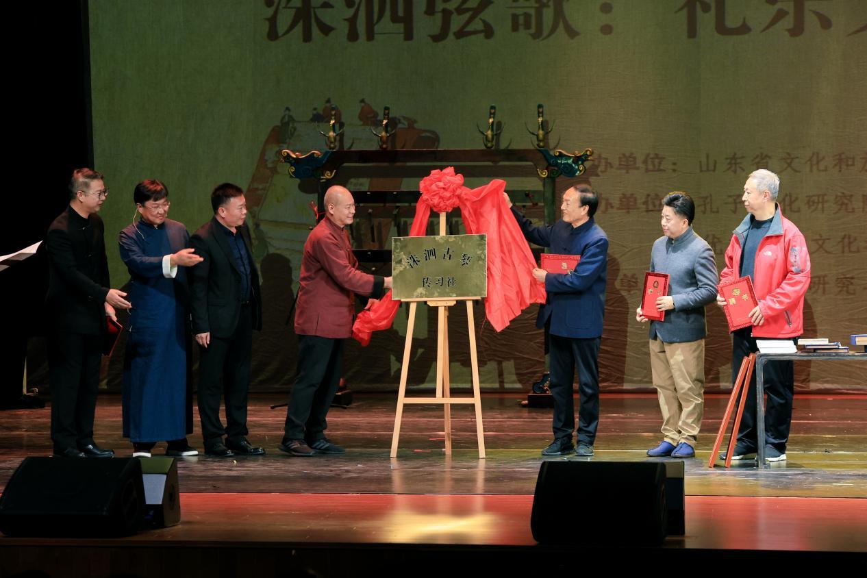 在接下来举行的“古琴传习仪式”上,汶水书院院长刘强先生首先展示了数件珍贵的齐鲁礼乐文献,随后袁梅郑重宣告“洙泗古琴传习社”成立。宋立林教授代表礼乐文化研究与推广中心为非遗研究专家郭学东、广陵与诸城两派传人茅毅、制琴名家杨景河、刘强院长及制琴名师刘琪等五位琴坛名家颁发聘书。诸位先生与曲阜市新华书店副经理马祥涛先生共同为“洙泗古琴传习社”揭牌,标志着这一融合文献研究、琴艺传习与制作技艺传承诸种功能于一体的古琴传承新平台正式启航。