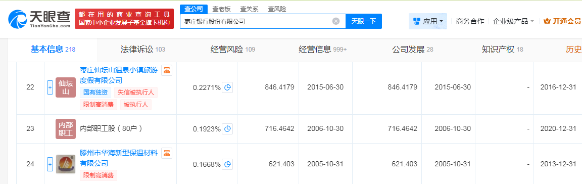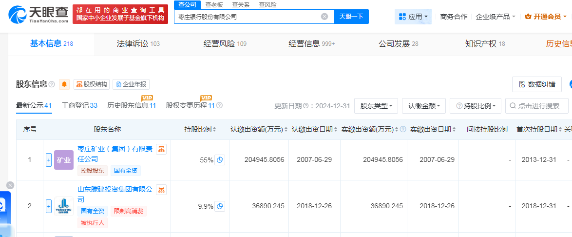 天眼查信息显示,目前,枣庄银行多家持股股东被列为被执行人、限制高消费、失信被执行人,其中就有前文提及的大股东山东滕建投资集团有限公司。