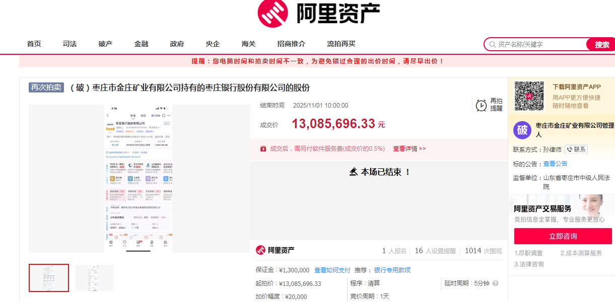 凤凰网山东近日从阿里资产平台获悉:枣庄市金庄矿业有限公司持有的枣庄银行股份有限公司24340953股股份拍卖于11月1日结束,成交价约为1308.57万元。本场拍卖仅有1人报名,围观人数超千人。