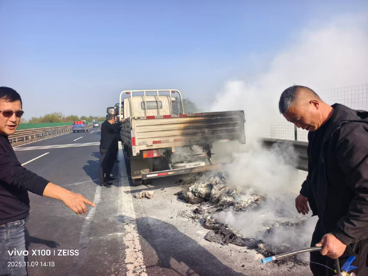 事情发生在11月9日上午,53岁的张宪良和董亚开着私家车,正赶往黄岛看望朋友。当车辆行驶至日兰高速距离莒县服务区还有6公里处时,前方路面突然升起的滚滚浓烟打破了平静。“老远就看见黑烟冲天,走近了才发现是一辆小货车在着火,火焰都蹿到很高了。”张宪良回忆道,当时货车的轮胎、车厢里的棉衣棉被都在燃烧,引擎盖下方更是火光四射,隐约能看到油箱的位置,情况十分危急。