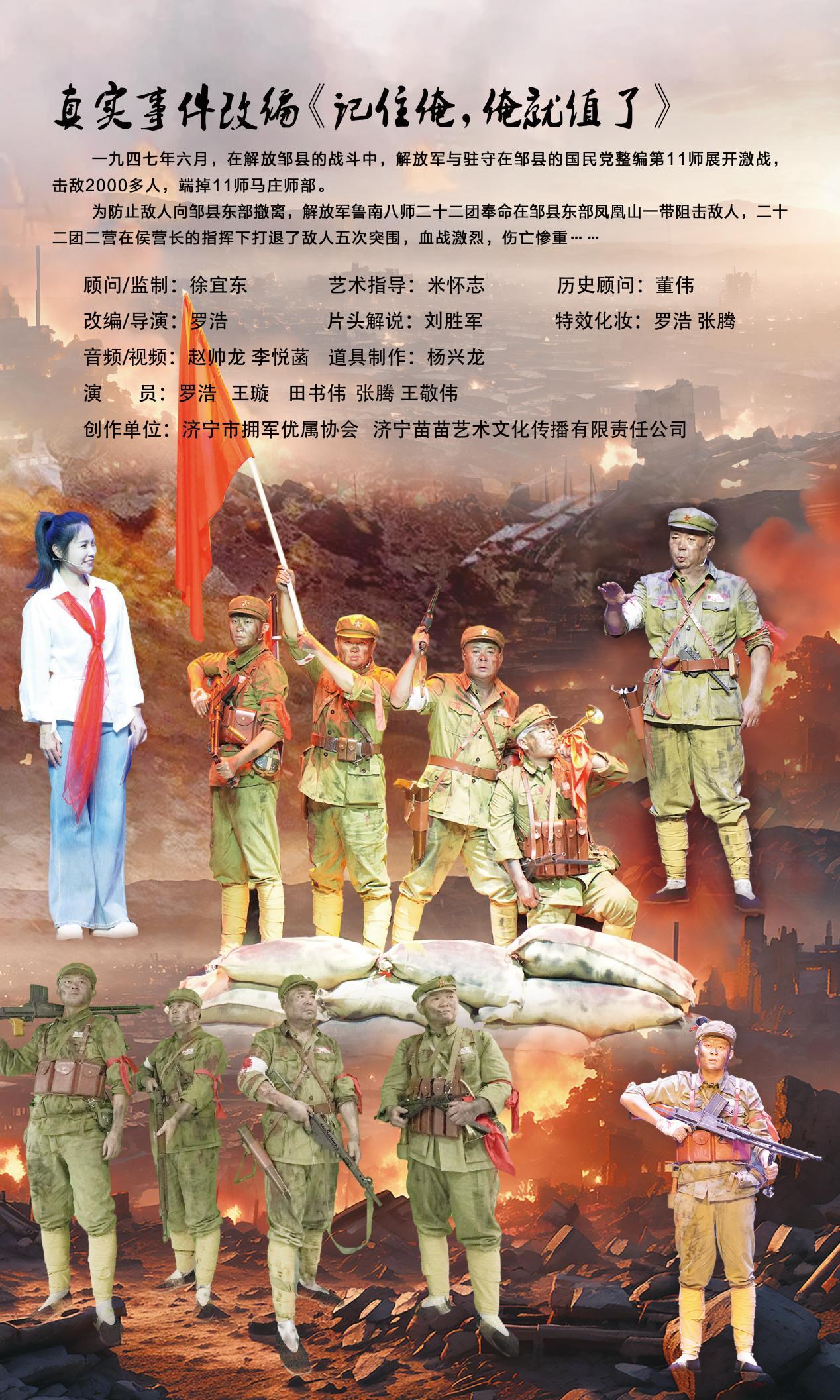 为弘扬伟大的爱国主义精神,实现历史记忆的传承、民族精神的凝聚以及对和平理念的传播。济宁市拥军优属协会、济宁苗苗艺术文化传播有限责任公司历时四个月创作穿越话剧《记住俺,俺就值了》,近期在邹城演出后引起很好社会反响。