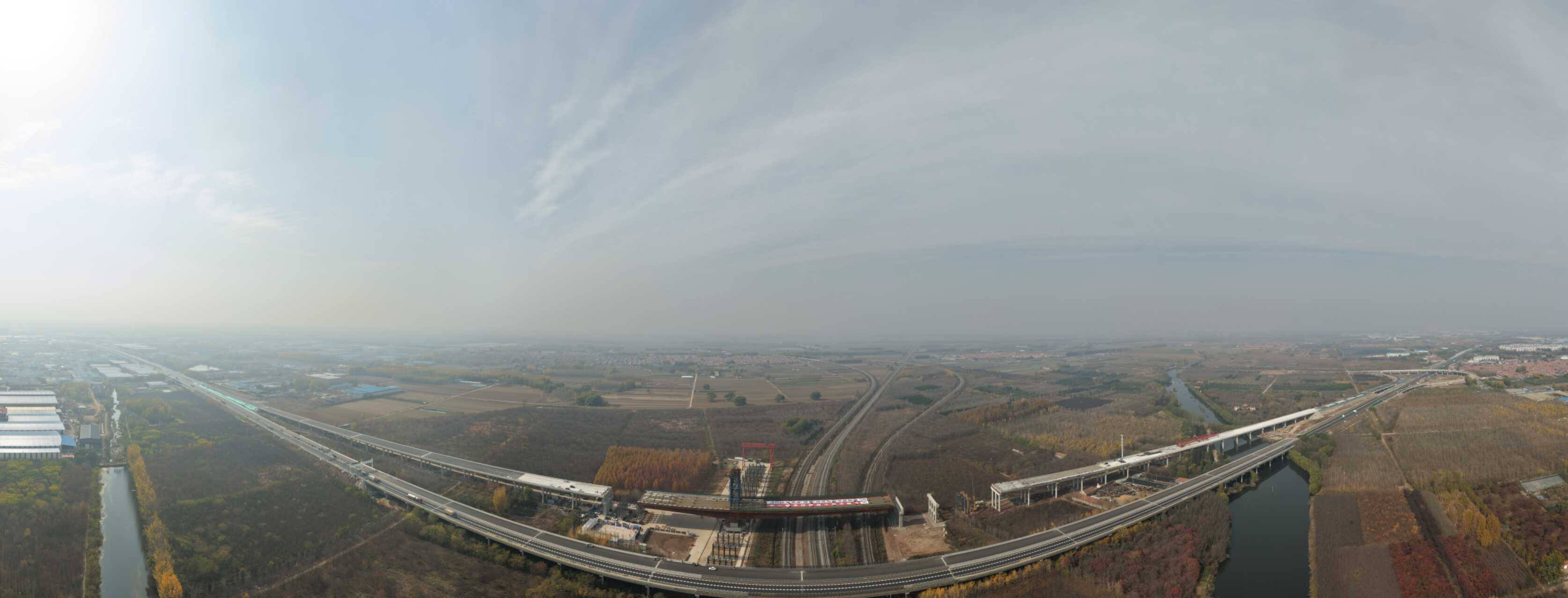 沈海高速在山东省境内全长359.079公里,正按双向八车道高速公路标准改扩建,设计时速120公里。此次完成转体的立交桥由中铁十局青岛公司承建,地处胶州市北外环西附近,全长275米。其转体部分采用(130+80)米耐候钢钢箱梁结构,重量达5286吨,是山东省目前规模最大的不等跨涉铁高速公路钢箱梁转体桥。