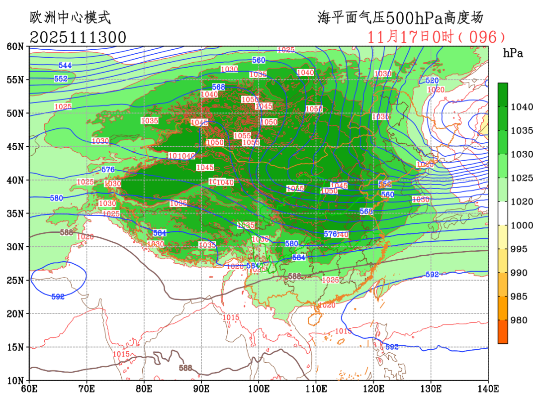 这次寒潮强度强,其冷高压中心可达1055百帕。如果说把我们头顶的天空比喻成一个巨大的“空气海洋”,通常情况下,这个“海洋”的平均压力大约是1010百帕,就像平静的海平面。1055百帕的高压中心会使得空气向四周气压低的地方流动,形成大风。中心气压越高,“推力”就越大,风也就越猛。同时,如此强大的高压,意味着背后有规模巨大的冷空气团,它所到之处,气温便会急剧下降。