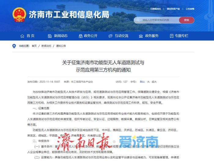 11月14日,济南市工业和信息化局发布通知,面向社会公开征集济南市功能型无人车道路测试与示范应用第三方机构。