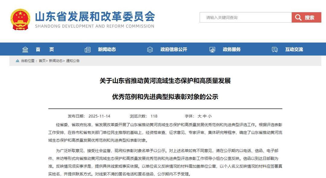 经省委、省政府批准,省发展改革委开展了山东省推动黄河流域生态保护和高质量发展优秀范例和先进典型评选工作。根据评选表彰工作安排,在各市和省有关部门单位民主推荐的基础上,经资格审查、征求意见、专家评审、集体研究等程序,确定了山东省推动黄河流域生态保护和高质量发展优秀范例和先进典型拟表彰对象。