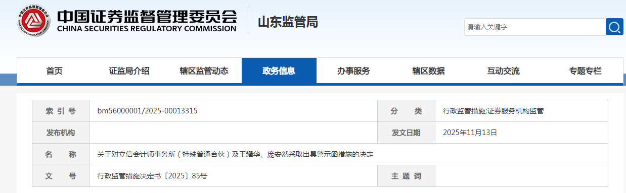 11月13日,山东证监局对外公布了《关于对立信会计师事务所(特殊普通合伙)及王耀华、庞安然采取出具警示函措施的决定》(行政监管措施决定书〔2025〕85号)。