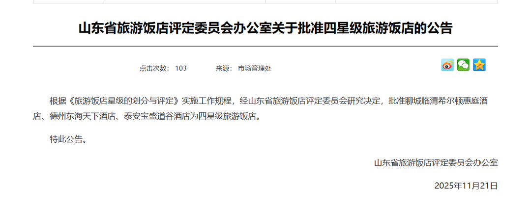 11月21日,山东省文化和旅游厅网站发布公告,根据《旅游饭店星级的划分与评定》实施工作规程,经山东省旅游饭店评定委员会研究决定,批准聊城临清希尔顿惠庭酒店、德州东海天下酒店、泰安宝盛道谷酒店为四星级旅游饭店。