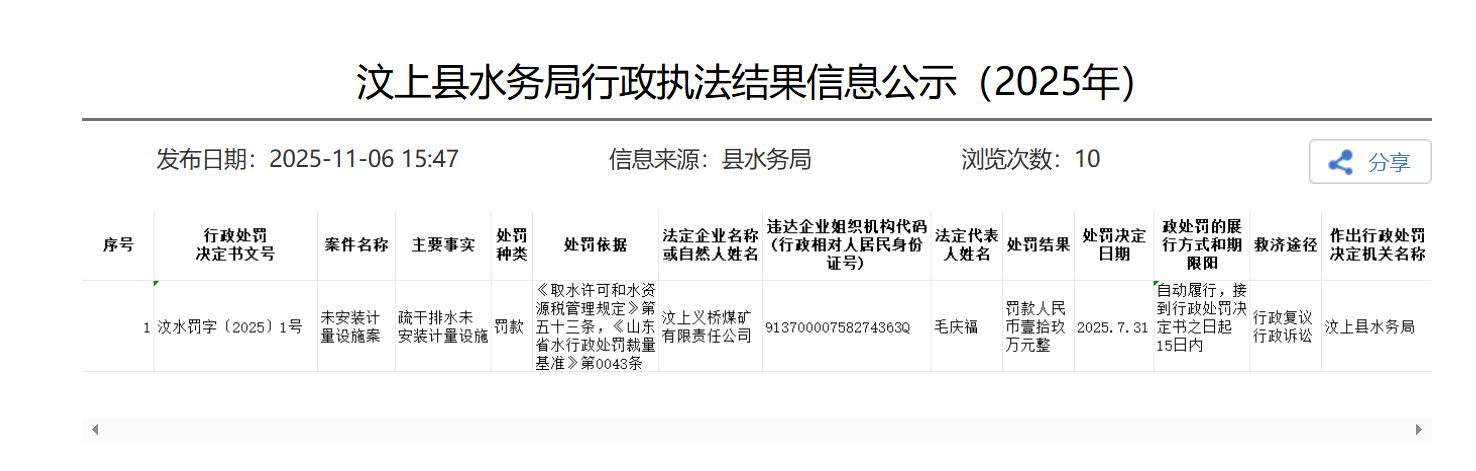 汶水罚字〔2025〕1号行政处罚决定书显示,汶上义桥煤矿责任有限责任公司(下简称:汶上义桥煤矿),因存在“疏干排水未安装计量设施”的违法违规行为,被汶上县水务局依据《取水许可和水资源费征收管理条例》及《山东省水行政处罚裁量基准》相关规定,处以人民币十九万元罚款,处罚决定日期为2025年7月31日。