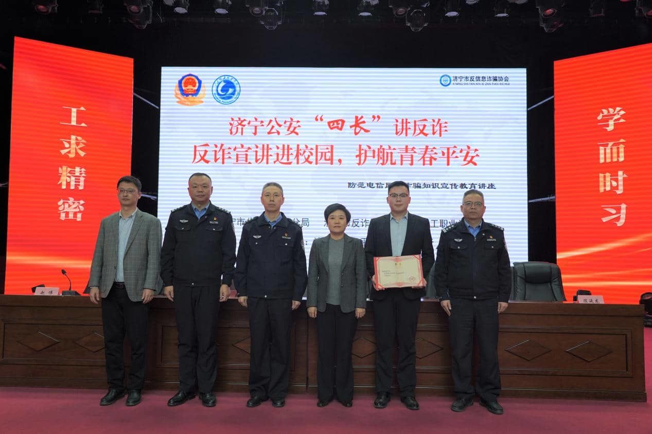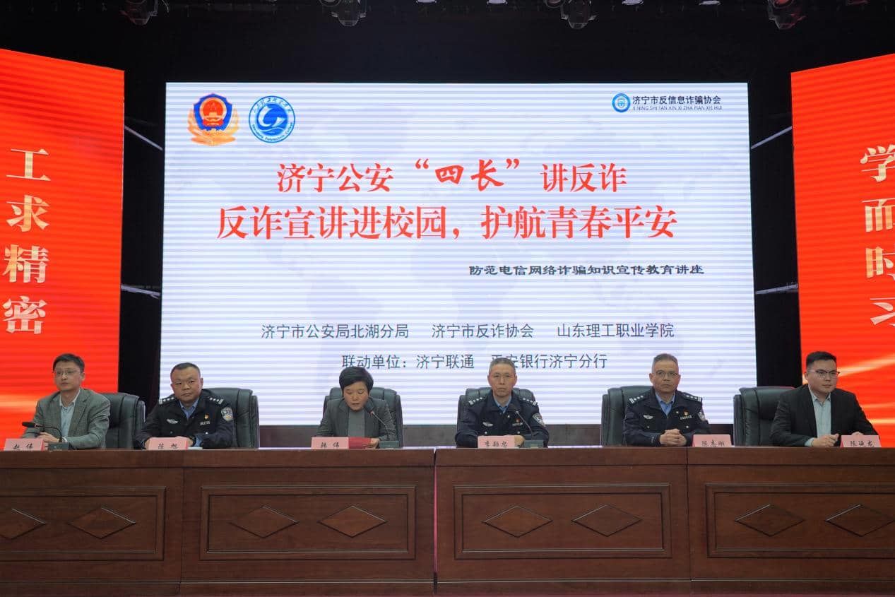 为强化校园反诈防线,提升师生风险防范能力,11 月 17日,济宁公安“四长”讲反诈暨校园警示讲座在山东理工职业学院开展。山东理工职业学院党委委员、副院长韩伟出席并致辞,济宁市公安局北湖分局党委书记、局长李颖忠作警示讲话,党委委员、副局长、许庄派出所所长陈旭,刑侦大队大队长陈志刚等其他相关同志参加,学院党委委员、学工部部长赵伟主持。