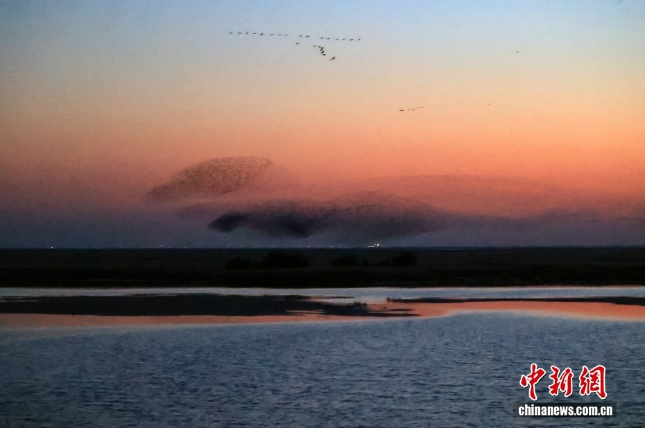 近日,在位于山东省东营市的山东黄河三角洲国家级自然保护区湿地上空,每天都会呈现“鸟浪”壮观景象。数万只花脸鸭腾空飞起,时而扶摇直上,时而俯冲直下,阵型瞬息万变。