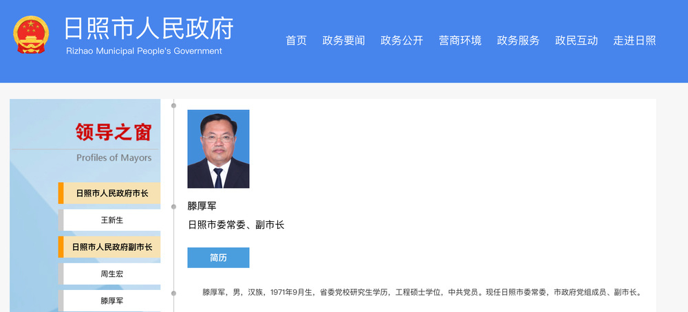 近日,日照市人民政府网站更新领导信息,滕厚军现任职务为日照市委常委,市政府党组成员、副市长。