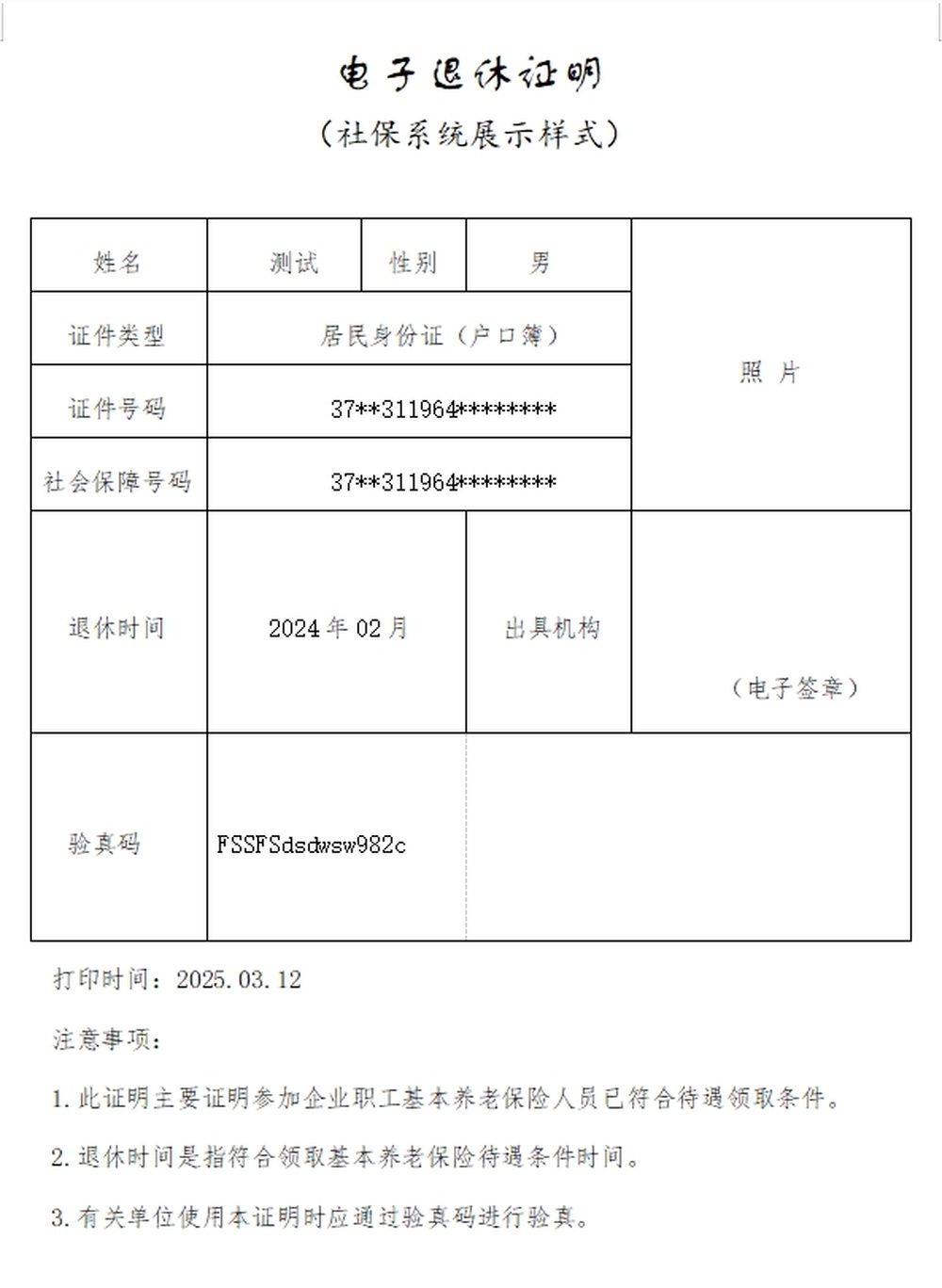 2.电子退休证明(社保系统展示样式)