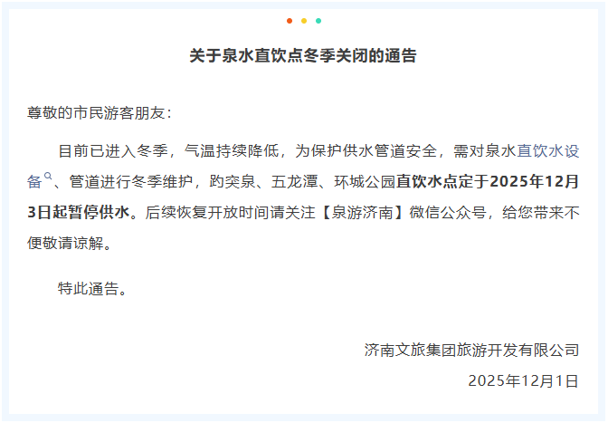 目前已进入冬季,气温持续降低,鲁网记者从济南文旅集团旅游开发有限公司处获悉,为保护供水管道安全,需对泉水直饮水设备、管道进行冬季维护,趵突泉、五龙潭、环城公园直饮水点定于2025年12月3日起暂停供水。