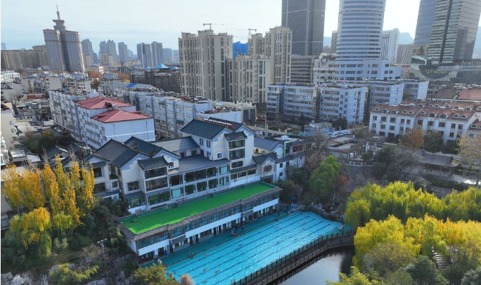 12月2日,泉城寒潮来袭,最低温仅-4℃,在护城河畔的泉水浴场,低温抵挡不住冬泳爱好者的热情,他们迎着寒风在泉水中体验冬泳的乐趣。空中俯瞰,泉水浴场犹如蓝宝石镶嵌在护城河中,与色彩斑斓的树木相映衬,分外迷人。(新黄河记者:王汗冰)