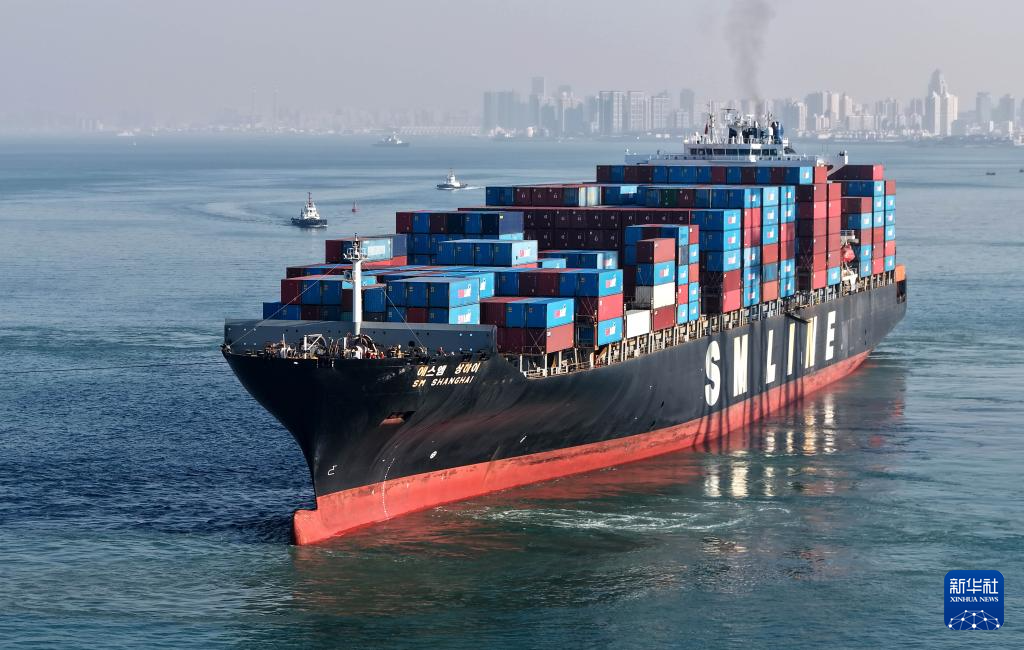 12月4日,一艘满载集装箱的货轮驶离青岛港前湾港区码头(无人机照片)。 连日来,山东港口青岛港巨轮频靠,作业繁忙,各单位向着全年目标冲刺。今年以来,作为中国北方重要的对外贸易门户,青岛港持续优化国际航线布局,将优质运力向新兴市场倾斜,构建起内外“环环相扣、无缝衔接”的运转体系。目前,青岛港外贸航线总数近240条,联通全球180多个国家和地区的700多个港口。(新华社记者 李紫恒 摄)