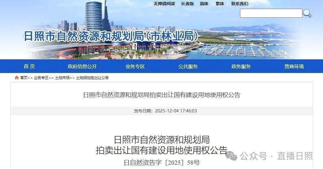 12月4日,日照市自然资源和规划局发布《拍卖出让国有建设用地使用权公告》。《公告》显示,经日照市人民政府批准,日照市自然资源和规划局决定拍卖出让以下3宗国有建设用地使用权。