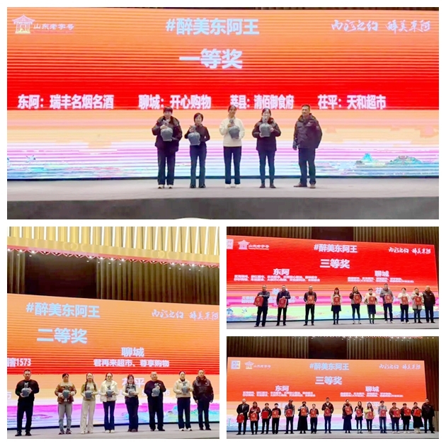 颁奖环节成为盛典的“高光时刻”。在“诗酒趁年华”诗词创作大赛颁奖中,10名优秀奖、5名铜奖、3名银奖获得者依次登台领奖,金奖得主现场分享创作心得,言语间满是对东阿酒文化的热爱。随后,聊城市电视台主持人、市朗诵协会主席邱广民以情景朗诵的形式演绎金奖作品,在古琴伴奏与舞蹈映衬下,诗词中的酒韵与诗意扑面而来,赢得全场掌声。紧接着,“醉美东阿王”短视频大赛奖项揭晓,获奖作品以镜头捕捉东阿酒的酿造过程、当地风土人情,用创意传递出东阿的人文温度与生活气息。