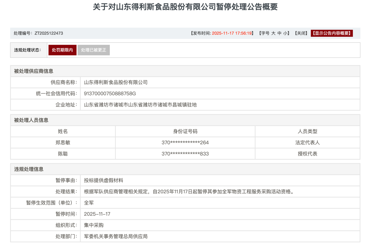 近日,军队采购网显示,军委机关事务管理总局供应局发布《关于对山东得利斯食品股份有限公司暂停处理公告》(处理编号:ZT2025122473)。公告指出,自即日起暂停山东得利斯食品股份有限公司(下称“得利斯”)参加全军物资工程服务采购活动的资格。