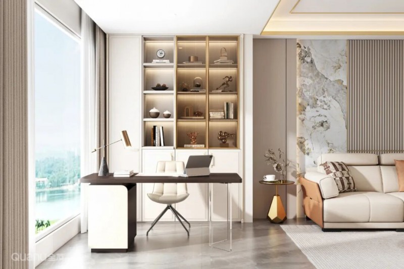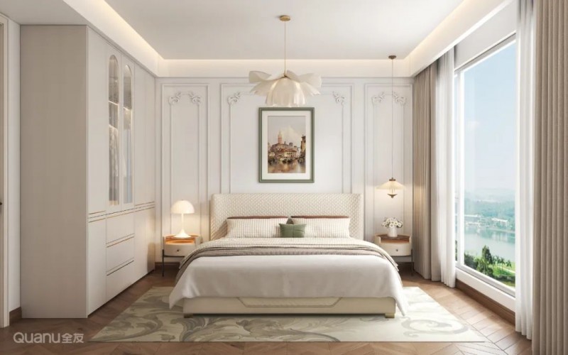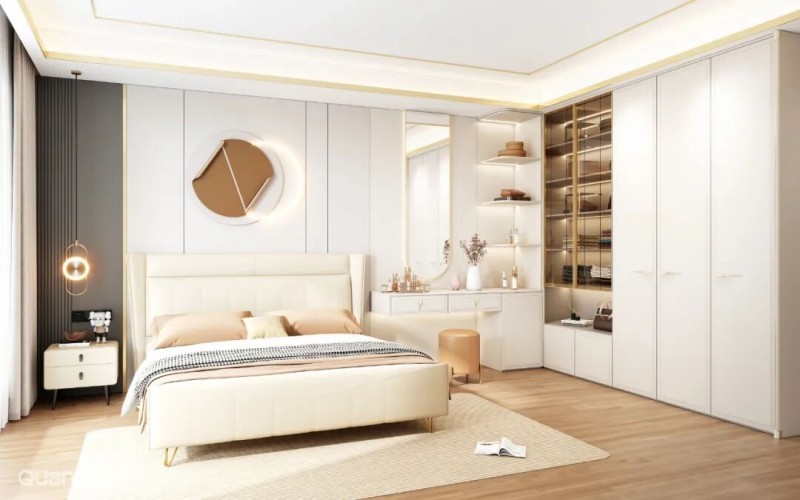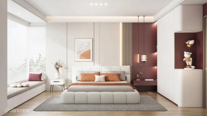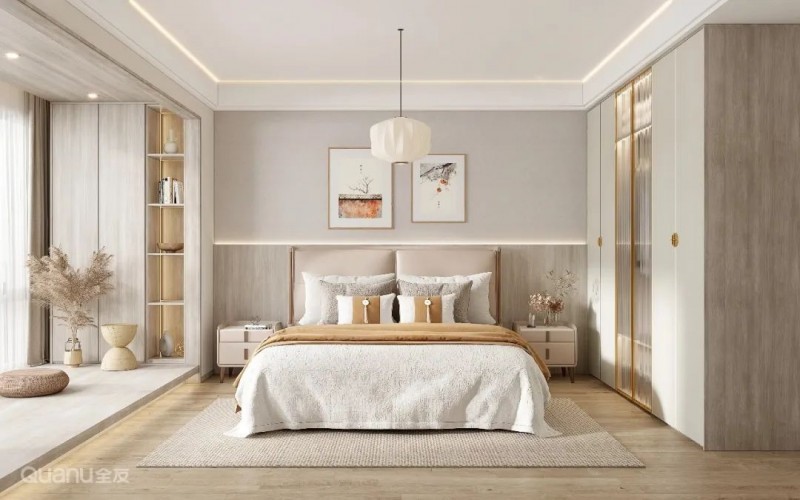 整体空间舒适简洁,注重留白。家具设计注重线条的流畅性和造型的精致感,可以选择玻璃柜门、石纹背板、金属拉手,也可以在柜门表面镶嵌金属线条,增强柜体的层次感与精致度。