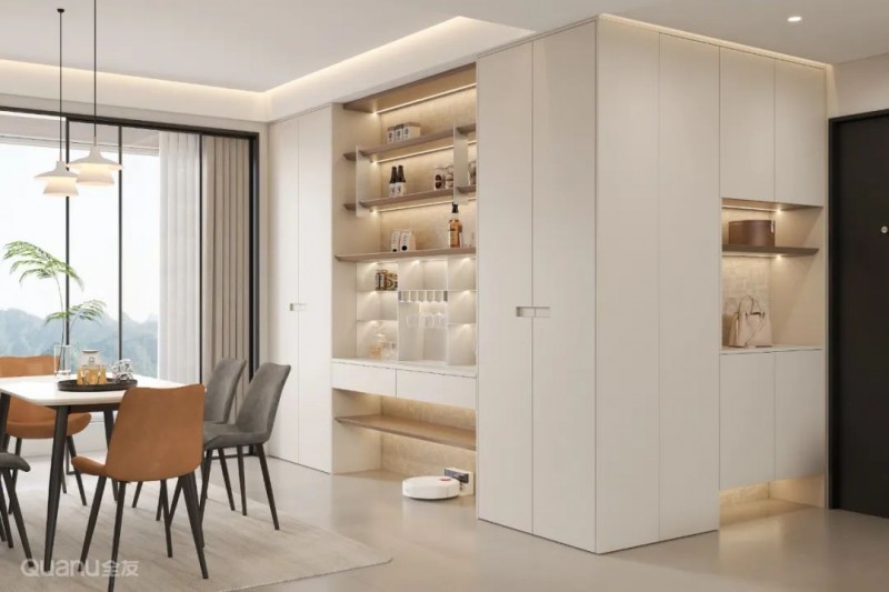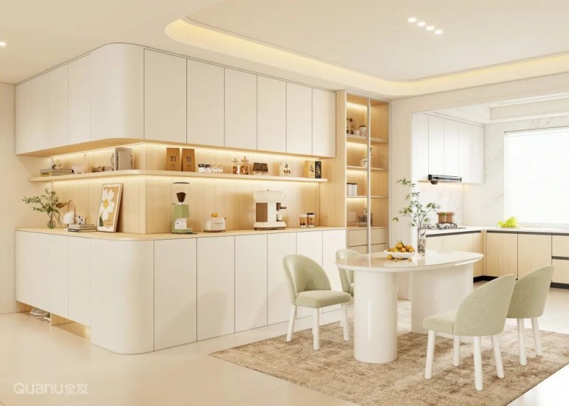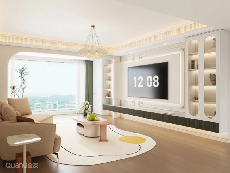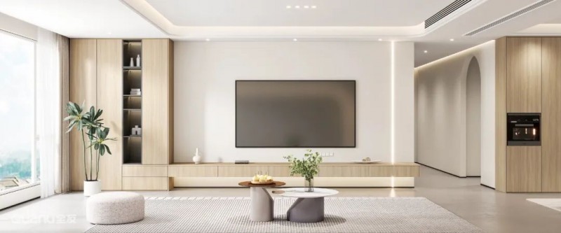 墙顶面注重留白,适当结合弧形元素柔化空间,如弧形石膏线、圆弧门洞等;定制柜体造型简约,可采用平开柜门,搭配隐形拉手或无拉手设计,在视觉上使空间更加整洁。