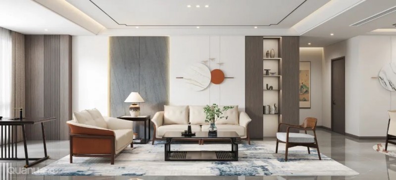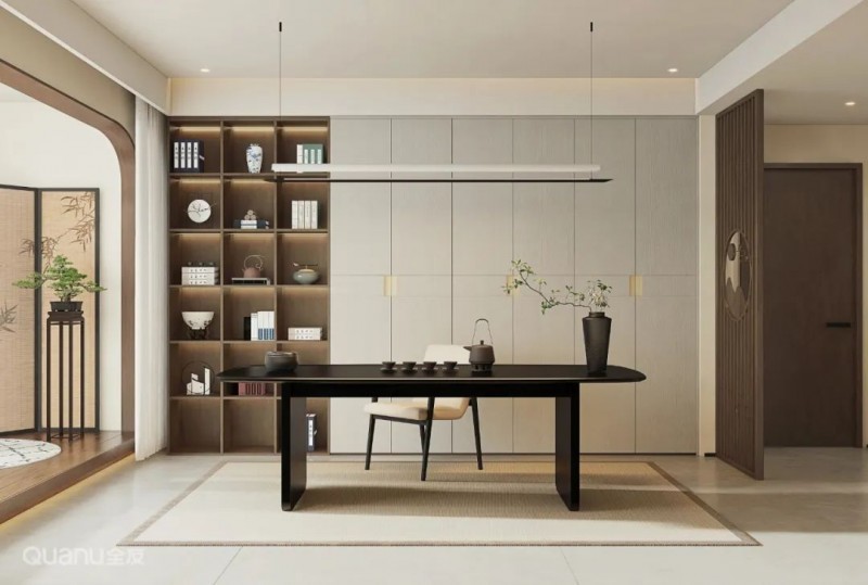 新中式多以白、灰、亚麻为主色调,使空间更加清爽、淡雅,再搭配深褐、紫檀等深木色,体现中式风格的沉稳与厚重,营造古朴、雅致氛围。
