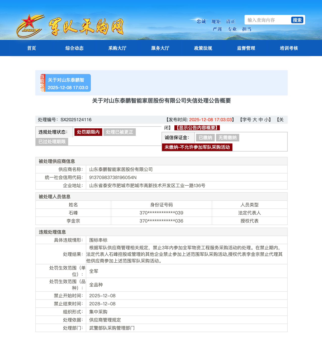 12月8日,军队采购网显示,武警部队采购管理部门发布《关于对山东泰鹏智能家居股份有限公司失信处理公告概要》(处理编号:SX2025124116)。公告指出,根据军队供应商管理相关规定,禁止山东泰鹏智能家居股份有限公司(下称“泰鹏智能”)3年内参加全军物资工程服务采购活动。