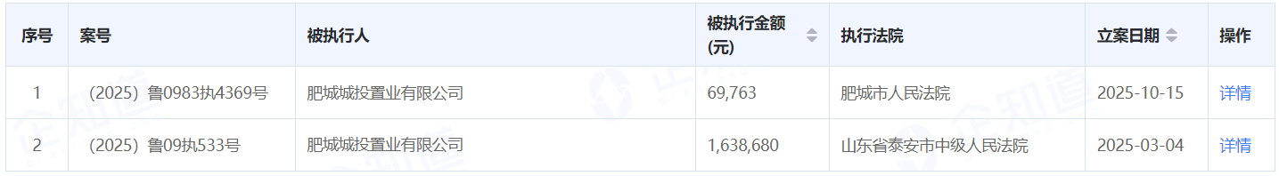 今年以来,肥城城投置业有限公司先后被山东省泰安市中级人民法院、肥城市人民法院列为被执行人,执行标的分别为69,763元、1,638,680元。